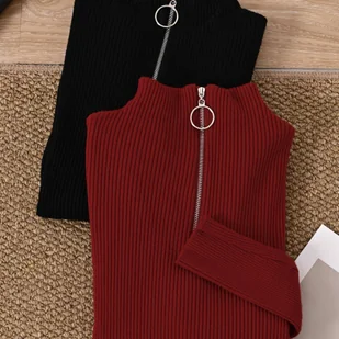 TEMU Zestaw Dwóch Stylowych Damskich Bluzek Warstwy Bazy Zapinanych na Zamek z Półwysokim Kołnierzykiem, Zaprojektowanych, Aby Być Dopasowanymi i