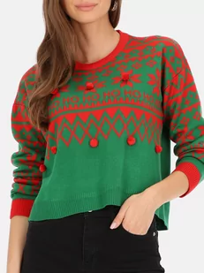 Sweter damski Rut od Eye For Fashion to wyrazisty kawałek garderoby, który wspaniale oddaje świąteczny klimat. Jego zielony kolor z czerwonym wzorem doskonale wpisuje się w zimowy sezon. Swobodny fason i lekko casualowy styl sprawiają, że jest to doskonały wybór na okres świąteczny. Delikatne pomponiki dodają uroku i charakteru temu wyjątkowemu swetrowi, który z pewnością doda radości każdej stylizacji.