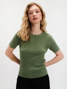 Przedstawiamy elegancki zielony sweter z fakturą, który doskonale sprawdzi się w każdej garderobie. Model posiada krótkie rękawy, co czyni go idealnym na cieplejsze dni, a faktura materiału dodaje mu unikalnego charakteru. Stonowany zielony kolor sprawia, że jest to uniwersalny element, który łatwo zestawisz z różnymi stylizacjami. Sweter jest świetnym wyborem zarówno na co dzień, jak i na bardziej formalne okazje.