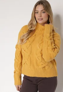 Żółty Golf z Domieszką Wełny Zdobiony Oryginalnym Splotem Fedwira