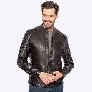 Skórzana kurtka męska – klasyka motocyklowego stylu Pewność siebie i niezależność w każdym detalu – ta kurtka z naturalnej skóry owczej to prawdziwa definicja męskiego charakteru. Z metalowym logo producenta, logowanymi suwakami i kontrastowymi przeszyciami, które nadają jej wyrazisty, odważny wygląd, idealnie łączy klasyczny krój z nowoczesnymi akcentami. Każda z kieszeni – dwie pionowe na zamek, jedna pozioma na klatce piersiowej oraz dwie wewnętrzne – łączy w sobie funkcjonalność i wygodę. Jednocześnie każda z nich zachowuje elegancki, stylowy charakter, który doskonale uzupełnia całość kurtki. Dla kogo? Jeśli masz w sobie duszę buntownika, kochasz klasykę z nutą rockowego pazura i nie uznajesz przeciętności – ta kurtka jest dla Ciebie.