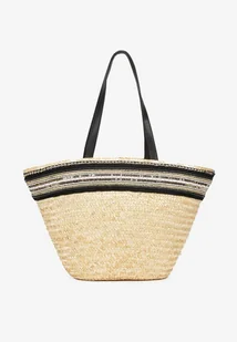 Beżowa Pleciona Torebka Shopper Ozdobiona Tasiemką Perłami i Cekinami Klubia
