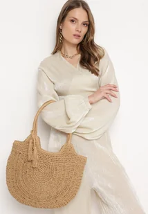 Ciemnobeżowa Okrągła Torebka Pleciona w Stylu Boho z Ozdobnym Chwostem Karasa
