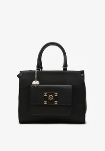 Czarna Torebka z Ekoskóry z Naszytą Kieszenią i Metalicznymi Okuciami Htilia