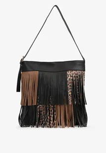 Czarno-Brązowa Kwadratowa Torebka Listonoszka z Ozdobnymi Frędzlami w Panterkę Ravalanna