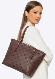 Shopperka z nowoczesnym twistem – elegancja, która dotrzymuje Ci kroku Szukasz torebki, która pomieści więcej niż tylko niezbędne minimum, a jednocześnie podkreśli Twój styl? Ta shopperka z ekoskóry, która doskonale imituje naturalną skórę, łączy w sobie funkcjonalność z nowoczesnym designem. Wytrzymały materiał odporny na ścieranie, zarysowania i uszkodzenia mechaniczne gwarantuje, że torebka zachowa nienaganny wygląd na długo. Dwie regulowane rączki pozwalają wygodnie nosić ją zarówno na ramieniu, jak i w dłoni, a odpinany pasek daje jeszcze więcej swobody stylizacji. Charakteru nadaje jej tłoczona sygnatura, wykonana specjalistyczną technologią i cieniowana, która wyróżnia ten model na tle innych. Dla kogo? Jeśli szukasz torebki do pracy, na uczelnię czy codzienne wyjścia, która pomieści więcej niż tylko portfel i telefon – ten model sprawdzi się idealnie.