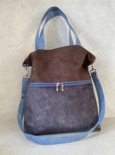 Duża torba na ramię z zapinaną kieszenią - c.brąz, szaroniebieski