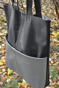 Torebka na ramię wykonana z dwóch kolorów skóry - bazowej czarnej i srebrnej (duża kieszeń na magnes). Po środku przeszycie z ostębnowaniem czarną nicią. Torba jest niezwykle pakowna, idealna na co dzień do ...
