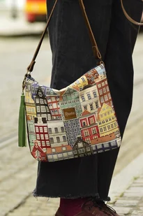 Torebka została wykonana z tkaniny gobelinowej, syntetycznego nubuku oraz skóry naturalnej ( regulowany pasek, łączenia oraz chwost).Całość zapina się na suwak, a wewnątrz znajduje się podszewka z dwiema ki ...