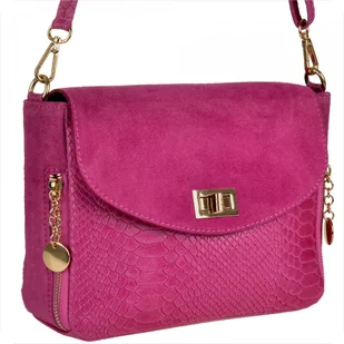Modna listonoszka wzór wężowej skóry z zamszem skóra naturalna fuksja Indeks: 1735 Proponujemy Paniom torebkę skórzaną listonoszkę w nowym fasonie produkcji włoskiej w rozmiarze M o ciekawej strukturze skóry połączenie zamszu i skóry ze złotymi okuciami w kolorze róż fuksjal. Torebka posiada zgrabny wygląd jest bardzo lekka, wygodna, elegancka oraz świetnie pomieści najpotrzebniejsze rzeczy, które chcemy mieć pod ręką. Wyprodukowana została ze starannie wyselekcjonowanych skór naturalnych. Pasuje do wielu różnych stylizacji i wyróżnia się doskonałą jakością wykonania.