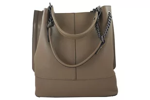 Wnętrze torebki: zamszowa komora główna torebki podzielona jest na pół dużą i pojemną zasuwaną kieszenią. Modna torebka skórzana damska jest zasuwana, posiada ciemne metalowe okucia, dwa uchwyty (skóra naturalna i łańcuszek) bez możliwości regulacji (długość 54cm, wysokość 21cm) oraz metalowe stopki na spodzie chroniące przed otarciem.