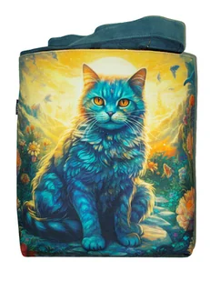 Autorska torba z usztywnionego eko zamszu, zapinana na zamek. Przód z weluru tapicerskiego. Pasek regulowany. Tył w kolorze paska (niebieski). Torba trzyma fason. Wewnątrz dwie kieszenie - jedna na za ...