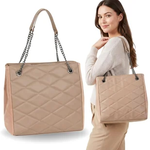 Mieści format A4. Wymiary: wysokość bez rączek - 28,5 cm wysokość z rączkami - 51 cm szerokość - 29,5 cm szerokość u podstawy - 15 cm długość rączek - 59 cm Najważniejsze cechy produktu: • Pikowany design – modne przeszycia nadają elegancji i podkreślają stylowy charakter torebki. • Beżowy kolor nude – neutralny, pasuje do każdej stylizacji, zarówno codziennej, jak i bardziej eleganckiej. • Łańcuszkowe rączki – metalowe elementy dodają torebce nowoczesności oraz wyrazistego stylu.