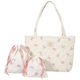 brak zamka Kieszonki wewnętrzne: 2 Kolor: biały, jasnoróżowy Wzór: kokardki Duży woreczek: Materiał: poliester Szerokość: 24 cm Wysokość: