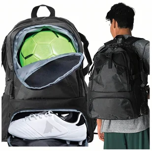 Plecak Torba Treningowa z Miejscem na Piłki Buty do Piłki Nożnej Koszykówki Plecak treningowy w kolorze czarnym, idealny do przechowywania piłki nożnej, koszykowej oraz butów. Z pojemną główną komorą i dodatkowymi bocznymi kieszeniami, pomieści wszystkie niezbędne akcesoria sportowe. Wygodne paski naramienne z oddychającej siateczki zapewniają komfort noszenia, a kompaktowe wymiary sprawiają, że plecak jest idealny na treningi, zawody czy codzienne użytkowanie. ➡️ Zalety Plecaka Torby Treningowej: ⚽👟 Przestronność: