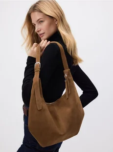Torebka o formie hobo, wykonana z imitacji zamszu.