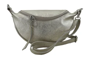 Wnętrze saszetki / nerki: jednokomorowe wnętrze jest wykończone podszewką. Wewnątrz znajduje się niewielka zasuwana kieszonka mieszcząca karty płatnicze, banknoty lub klucze. Saszetka nerka skórzana damska posiada srebrne okucia, długi pasek z regulacją umożliwiający noszenie torebki wygodnie przełożonej przez ramię, zupełnie nie krepującej ruchów podczas spacerów, zakupów lub spotkania ze znajomymi (maksymalna dł. 142cm, maksymalna wys. 74cm) oraz możliwość zawieszenia ozdoby / breloczka przy suwaku. Modna saszetka nerka skórzana damska metaliczna to idealne uzupełnienie stylizacji zarówno codziennej casualowej lub na wyjątkowe okazje.