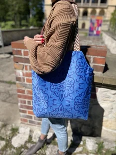 Shopperka - niebieska torebka na ramię, zapięcie magnetyczne, wewnętrzna kieszonka na zamek. Mieści A4, - w środku porządna wiskozowa podszewka. Autorski wzór na tkaninie. Zapras ...