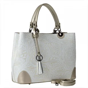 Torebka zasuwana jest na zamek oraz jest dołączony do torebki regulowany pasek. Opisywany model jest bardzo lekki i poręczny, można nosić torebkę na ramieniu lub trzymać za ucha. Wewnątrz umieszczone są dwie kieszonki bez zamka na komórkę lub dokumenty i jedna z zamkiem oraz jedna duża przegroda z zamkiem po środku. Po zewnętrznej stronie na białym tle skóry znajdują się motywy liści w kolorze złota. Jest to bardzo oryginalny i ciekawy wzór, niepowtarzalny i jedyny w swoim rodzaju.