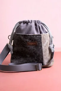 Mała damska torebka typu worek z kominem. Wykonana z szarej tkaniny. Z przodu oraz z na tyle torebki kieszenie (np. na telefon czy chusteczki) w stylu patchworkowym. W środku kieszonka zapinana na s ...