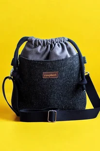 Mała damska torebka typu worek z kominem. Wykonana z szarej tkaniny. Z przodu oraz z na tyle torebki kieszenie (np. na telefon czy chusteczki) z czarnej/melange plecionki. W środku kieszonka zapinana n ...