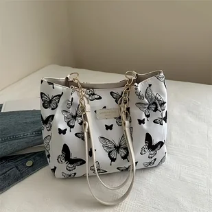 TEMU Elegancka torebka na ramię z płótna z nadrukiem artystycznym w kwiaty i motyle, z odpinanym paskiem - przestronna, stylowa damska torebka na