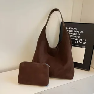 TEMU Damska torba na ramię o dużej pojemności, nowość sezonu jesień- 2026 Zestaw torebek i portfeli z imitacji zamszu, khaki, kawa, jasnobrązowy,