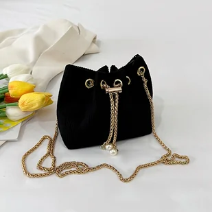 TEMU Sztruksowa Torba Wiadro z Łańcuszkowym Paskiem i Zapięciem na Sznurek - Koreańska Moda Torba na Ramię, Sztruksowa Torba Wiadro Odpowiednia na Co