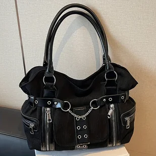 TEMU Ta sztruksowa torebka na ramię w stylu gotyckim z blokami kolorów, ozdobiona łańcuszkiem, charakteryzuje się dużą pojemnością, wieloma zamkami