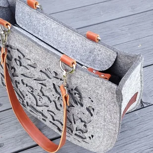 Duża, pojemna i kobieca torebka filcowa na ramię. Przyciąga uwagę dzięki pięknemu ażurowi z motywem roślinnym. Ma zaokrąglony kształt i wzmocnione dno z nóżkami dzięki którym można ją postawić. Została zaprojek ...