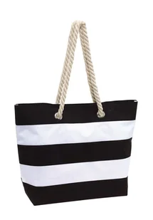 Torba plażowa Sylt. Budowa: W paski w marynistycznym stylu. Przestronna komora główna zamykana na rzep. Wewnątrz dodatkowa kieszonka na zamek błyskawiczny. 2 sznurkowe uchwyty wykonane z bawełny z metalowymi oczkami.