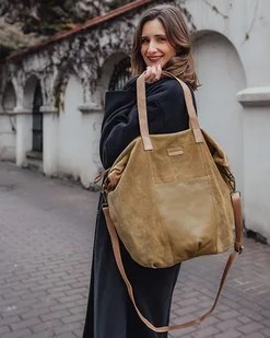 Torba skórzana zamszowa shopper z kieszeniami - beżowa