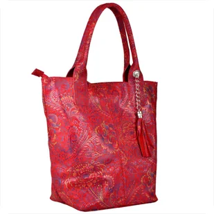 Torba worek skóra naturalna czerwona wzór kwiaty Borse in Pelle Indeks: 3430 W naszej ofercie proponujemy Paniom torebkę skórzaną XL produkcji włoskiej, nowy wzór, bardzo lekką, pojemną, wygodną, mieszczącą format A4 w ciekawym wzorze w kolorowe kwiaty na czerwieni. Wykonana jest ona z bardzo miękkiej naturalnej skóry włoskiej najwyższej jakości o ciekawej strukturze i kolorze. Będzie na pewno ozdobą każdego stroju kobiety. Można ją nosić na ramieniu lub trzymać za ucha.