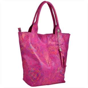 Torba worek skóra naturalna fuksja wzór kwiaty Borse in Pelle Indeks: 1975 W naszej ofercie proponujemy Paniom torebkę skórzaną XL produkcji włoskiej, nowy wzór, bardzo lekką, pojemną, wygodną, mieszczącą format A4 w ciekawym wzorze w kolorowe kwiaty delikatnie połyskującą na srebrno. Wykonana jest ona z bardzo miękkiej naturalnej skóry włoskiej najwyższej jakości o ciekawej strukturze i kolorze. Będzie na pewno ozdobą każdego stroju kobiety. Można ją nosić na ramieniu lub trzymać za ucha.