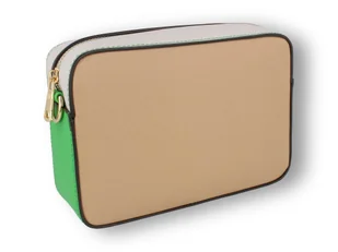 Torebka damska listonoszka w kolorach: zielonym, szarym i beżowym. Idealna na każdą okazję, praktyczna w codziennym użytkowaniu. Dwie osobne kieszenie wewnętrzne oraz kieszonka zewnętrzna. Okucia koloru złotego.