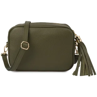 Torebka damska skórzana listonoszka z frędzlem skóra włoska na ramię Rewelacyjna, mała, zgrabna listonoszka wykonana we Włoszech z naturalnej skóry licowej w pięknym kolorze oliwkowym. ✨ Włoska Jakość i Perfekcja Detali: Materiał: Torebka została wyprodukowana we Włoszech z wysokiej jakości naturalnej skóry licowej o "groszkowej" fakturze. Wykonanie: Niezwykle starannie wykonana, z dbałością o najdrobniejsze szczegóły. Okucia: Posiada solidne okucia w złotym kolorze.