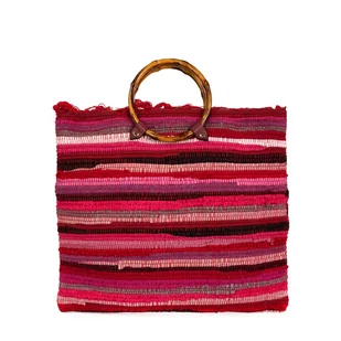 Oryginalna torebka na lato z tkaniny, z bambusowymi uchwytami. Posiada w środku jedną, główną komorę, która pomieści wszystkie niezbędna plażowe akcesoria. Swoją fakturą przypomina pięknie pleciony, handmadeowy dywan, co czyni ją niezwykle efektowną. Ta wyrazista torebka będzie świetnym dopełnieniem kobiecych stylizacji z naturalnych, jednolitych materiałów.