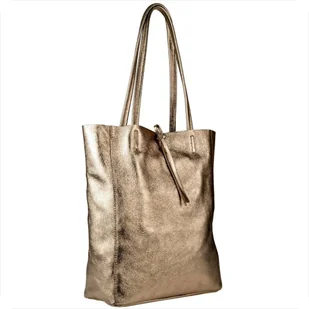 Torebka skórzana lekka shopper stare złote Indeks: 1519 Prezentujemy Paniom torebkę BORCE IN PELLE skórzaną shopper w kolorze starego złota w rozmiarze XL, uszytą ze starannie wyselekcjonowanych skór włoskich, bardzo modny wzór, pojemną mieszczącą format A 4. Prezentowany model jest bardzo elegancki i przyciąga uwagę perfekcja wykonania. Torebka wykonana jest z bardzo lekkiej skóry mimo swojego dużego rozmiaru, mieści format A 4. Wewnątrz torebki jest umieszczona jedna kieszeń z zamkiem, całość jest zawiązywana skórzanym paskiem.