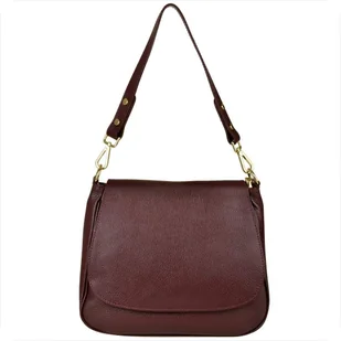 Torebka skórzana na ramię bordowa L włoska Indeks: 2999 Proponujemy Paniom zgrabną i bardzo poręczną torebkę skórzaną w kolorze bordowym L półokrągłą, wykonana ze starannie wyselekcjonowanych skór włoskich licowych z dopieszczeniem najdrobniejszych detali. Torebka jest bardzo lekka i pakowna, można nosić ja na ramieniu i także na skos jako większą listonoszkę, bo posiada dopinany regulowany pasek a. Elementy metalowe w torebce są w kolorze złotym. Torebka posiada dwie kieszenie z zamkiem i dwie bez.
