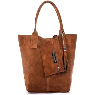 Śliczna, miękka, lekka, skórzana torba- worek w koniakowym kolorze, wyprodukowana we Włoszech, z włoskiej skóry naturalnej zamszowej