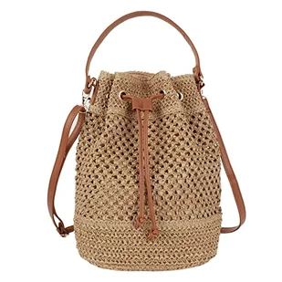 Van Caro Straw Shoulder Bag Handwoven Drawstring Bucket Bag Beach Bag for Women Light Coffee
