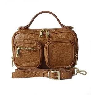 Zgrabny elegancki kuferek, listonoszka kieszonki A5 złote okucia Vera Pelle Camel VPMC15C
