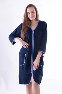 Damski szlafrok wykonany jest z przewiewnej bawełny z domieszką. Jest ciemno niebieski z jasno niebieskimi aplikacjami. Szlafrok jest krótki. Ma rękawy 3/4 długości. Wyprodukowany jest z przyjemnego bawełnianego materiału z domieszką elastanu.