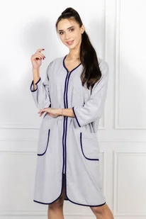 Damski szlafrok wykonany jest z przewiewnej bawełny z domieszką. Jest szary z granatowymi aplikacjami. Szlafrok jest krótki. Ma rękawy 3/4 długości. Wyprodukowany jest z przyjemnego bawełnianego materiału z domieszką elastanu.