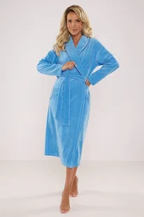Wysokiej jakości welurowy szlafrok damski w niebieskim kolorze. Szlafrok wykonany jest z miękkiego, chłonnego weluru (głównie bawełny). Posiada długie rękawy i kołnierz. Szlafrok wyposażony jest w kieszenie.