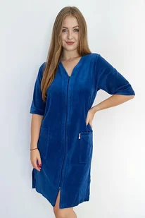 Welurowy szlafrok Hortensia ma piękny królewski niebieski kolor i jest zapinany na suwak. Szlafrok jest wykonany z bawełnianego weluru z domieszką bawełny, dzięki czemu jest przyjemnie ciepły i jednocześnie chłonny. Ma krótsze rękawy 3/4. Zapinany jest na suwak. Ma ok. 95 cm długości (zmierzono rozmiar M).