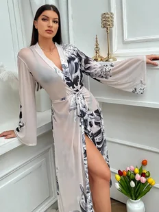 CECHY PRODUKTU: Długi, satynowy szlafrok Lekki materiał Elegancki styl Motyw chryzantem