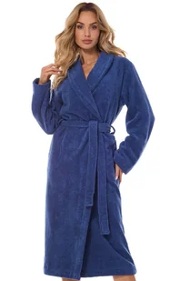 Długi szlafrok damski granatowy 2408 wykonany z miękkiej bawełnianej dzianiny typu frotte. Posiada stylowy szalowy kołnierz oraz wiązanie w pasie, które pozwala na idealne dopasowanie do sylwetki. Dodatkowo wyposażony jest w praktyczne kieszenie po bokach, zapewniające wygodę i funkcjonalność.