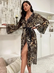Długi szlafrok damski w panterkę - Brązowy