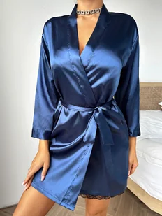 Krótki satynowy szlafrok damski z wiązaniem - Granatowy XL